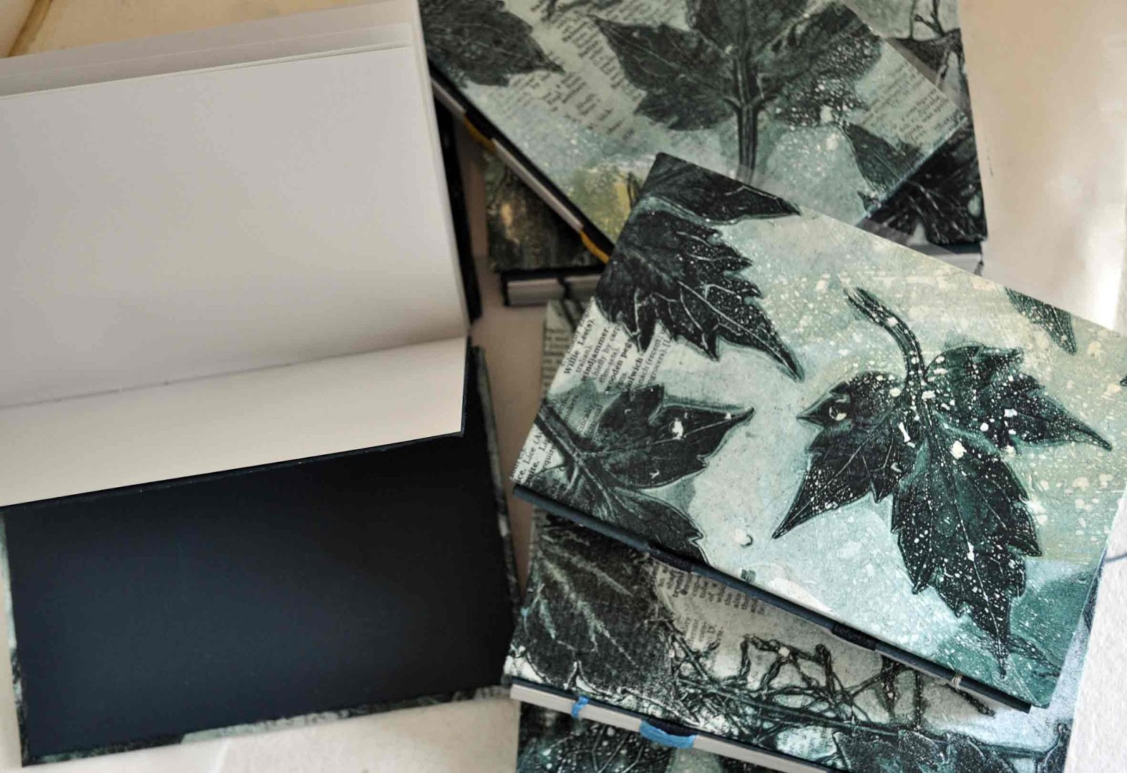 I thought this would be a quick project but like most projects there was a lot of fiddling! I made the covers by gelatine printing Clematis leaves on old Encyclopedia pages. (Ex Readers Digest - the pages print well as they are quite absorbent. Used one of my favourite colours for this process - green black.) Then I couldn't find end papers to match so handprinted